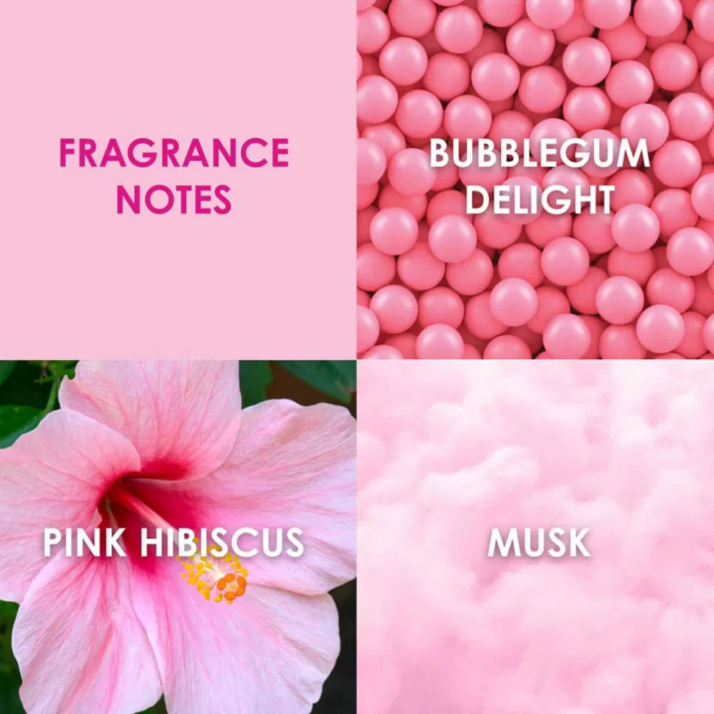 The fragrance opens with a delicious blend of Bubblegum Delight, juicy Strawberry, and sparkling Orange, creating a decadent first impression. At its heart, Pink Hibiscus, Jasmine Sambac Absolute, and Lily of the Valley provide a floral embrace, while a base of Musk, Sandalwood, and Pink Velvet Cupcake Accord adds warmth and lingering sweetness for an irresistibly playful finish.